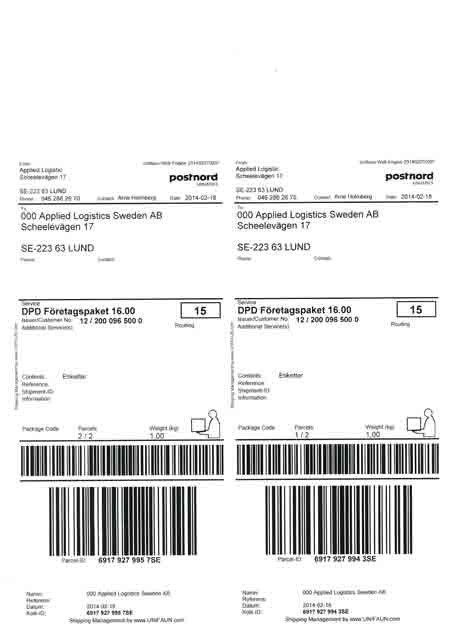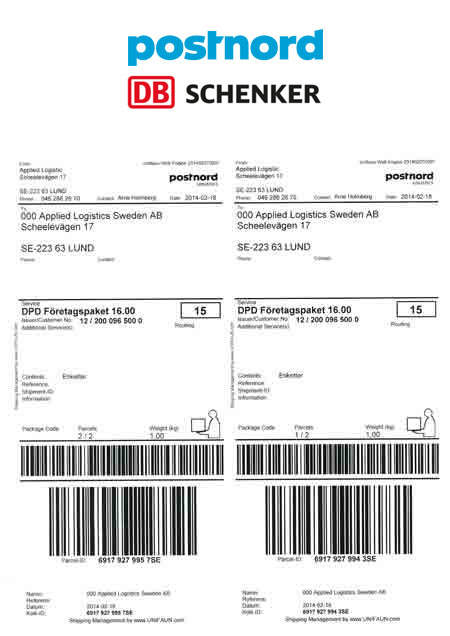 Laserark med transportetiketter 105x270 mm, 500ark / kartong (2etiketter / ark). För Schenker & Posten, med kvittodel.